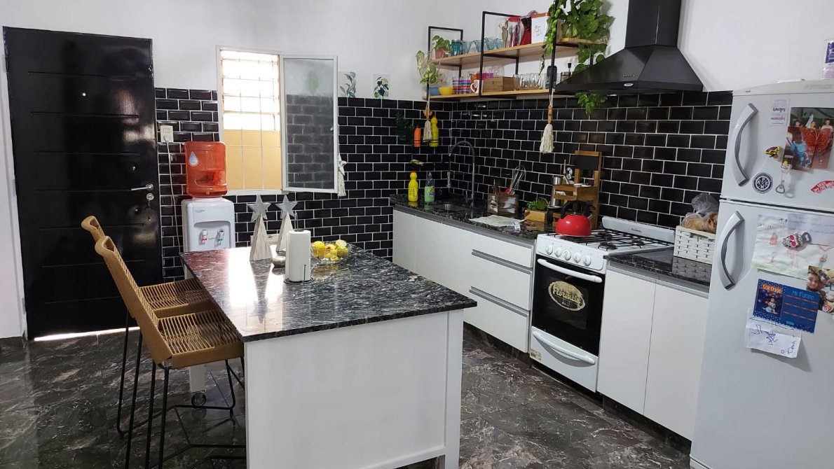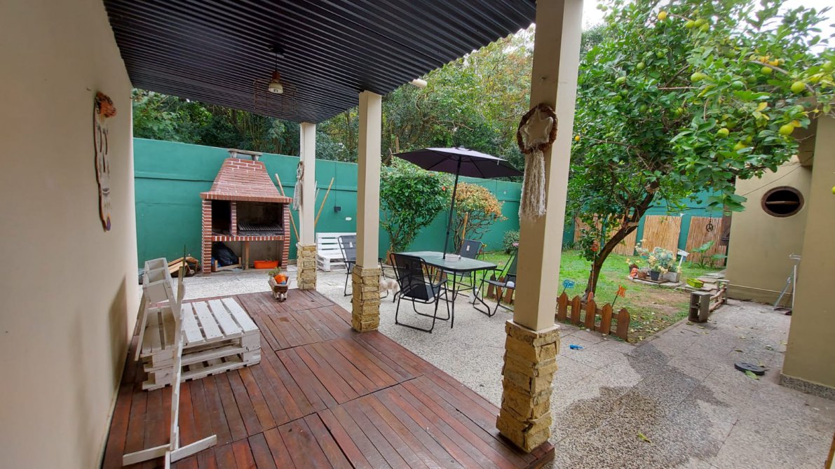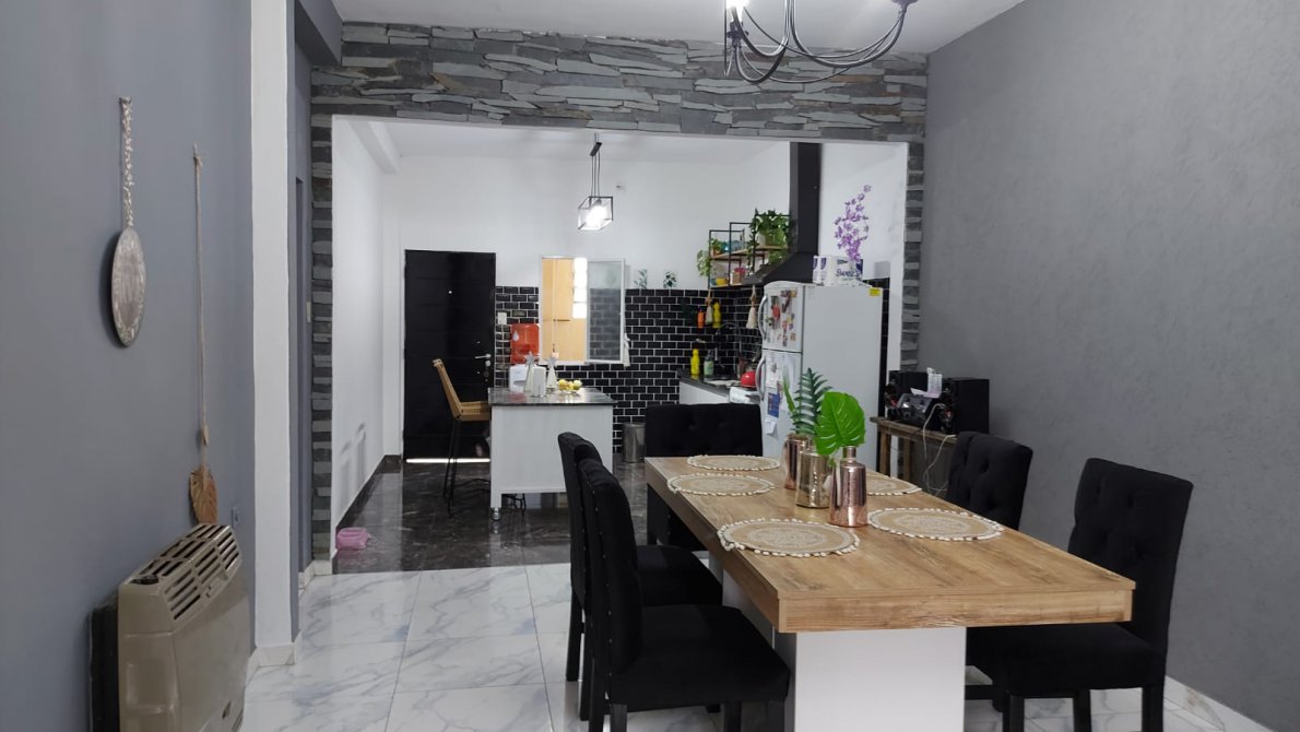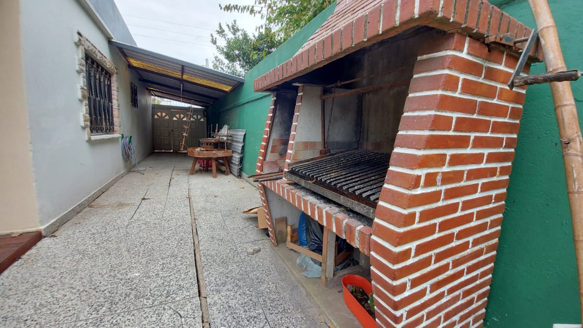 Cuenta con frente de jardin con cochera pasante para 3 vehiculos, living-comedor y cocina amplia.