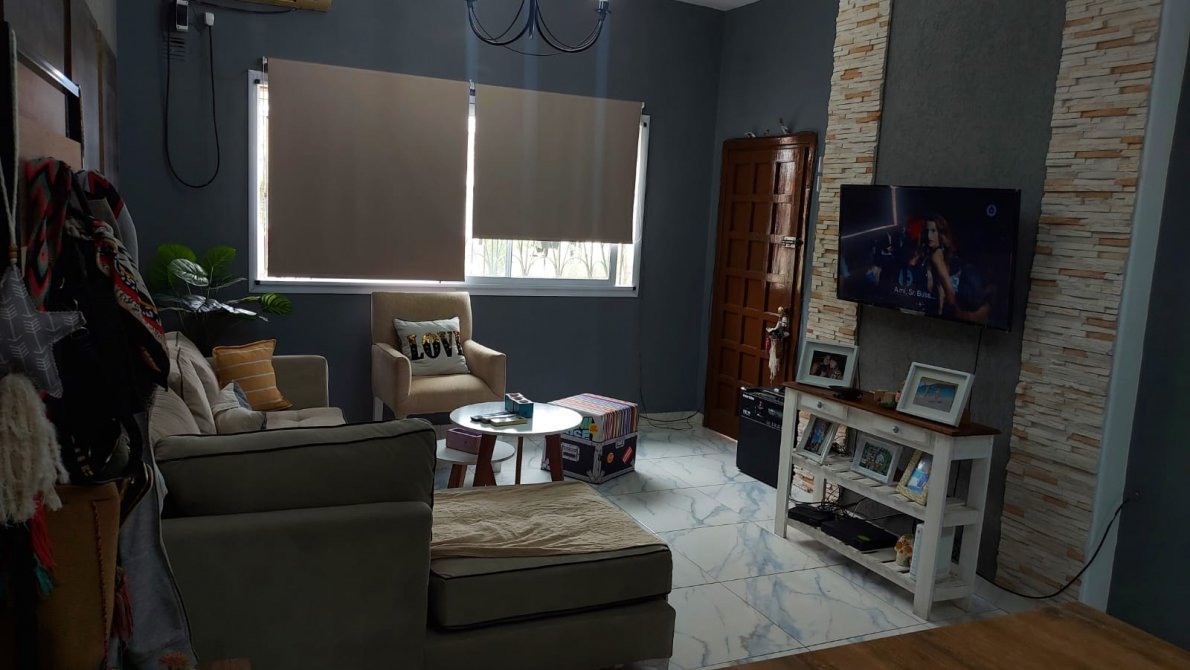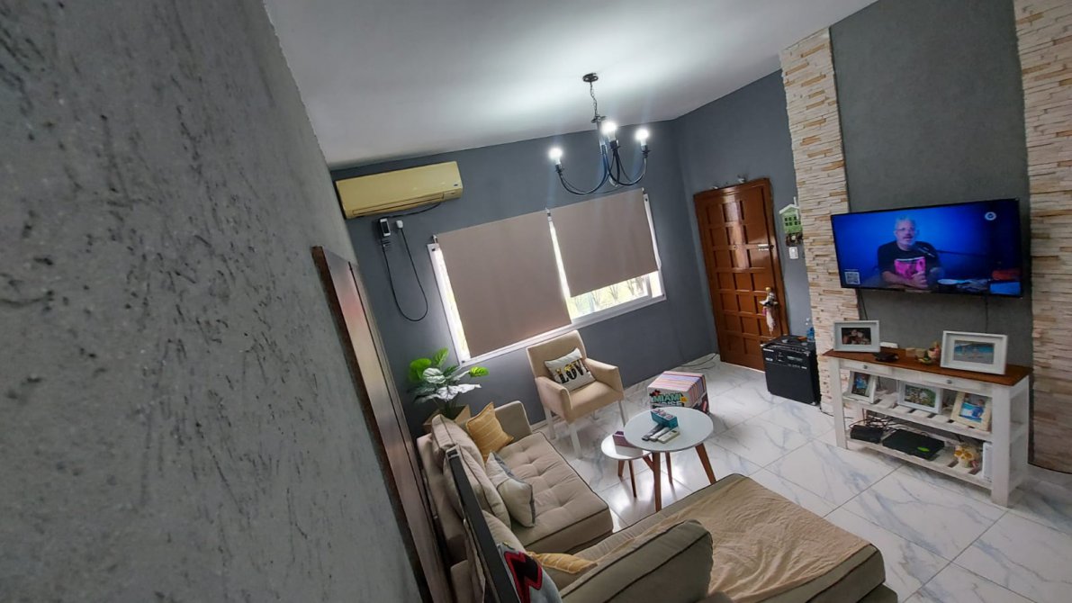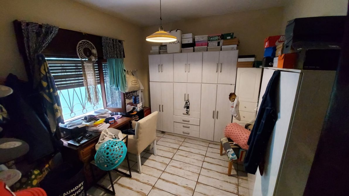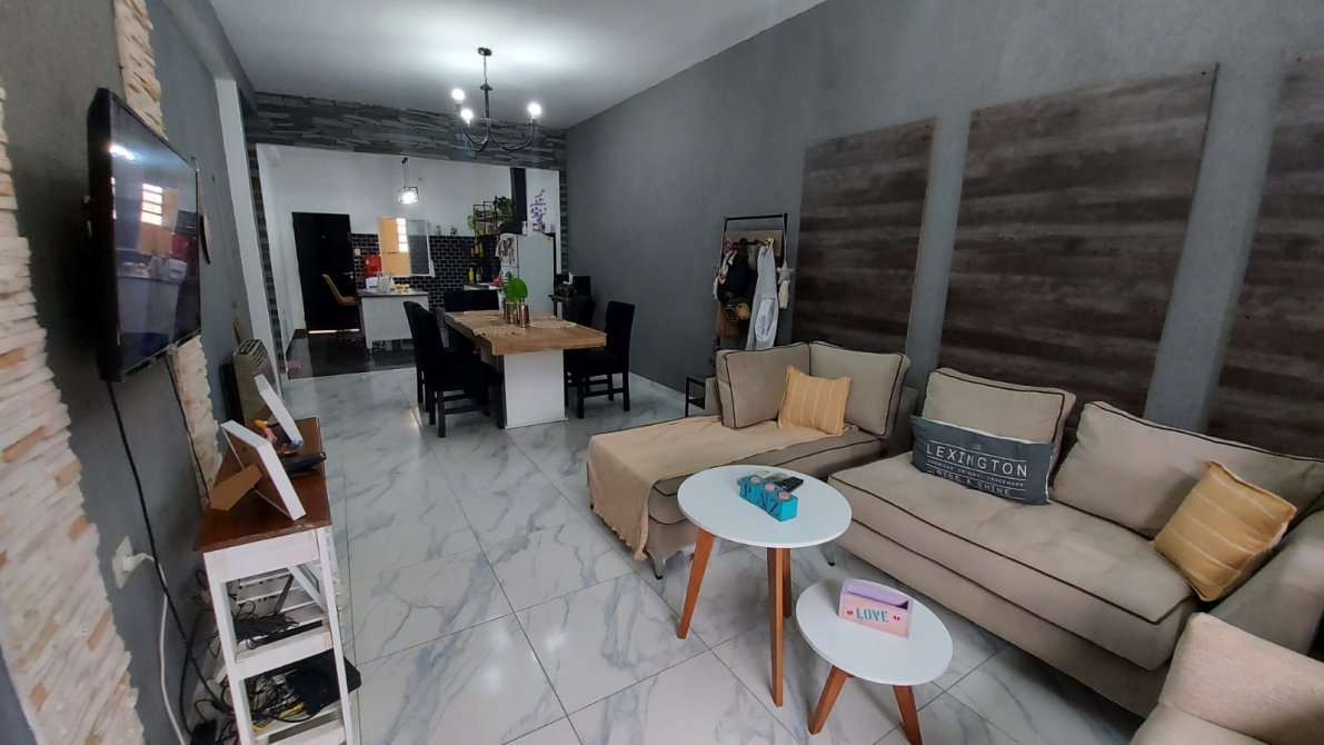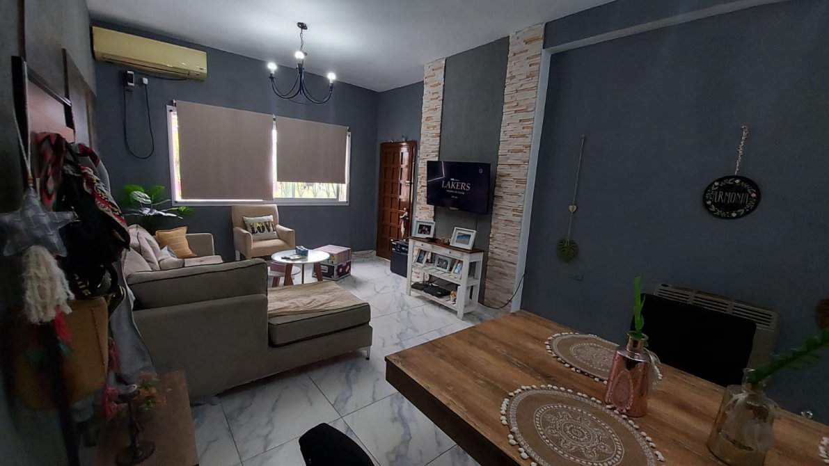 Cuenta con frente de jardin con cochera pasante para 3 vehiculos, living-comedor y cocina amplia.