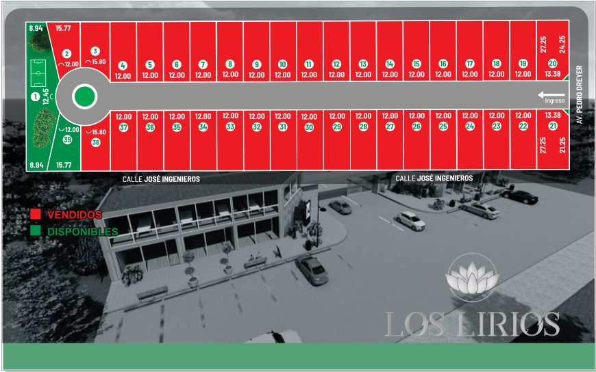 La medida de cada lote es de 12mts de frente por 27.25mts de fondo. Superficie de 327mts cuadrados.