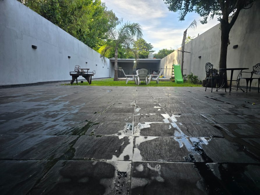 PATIO EN FRENTE, COCHERA TECHADA, PATIO EN FONDO CON JARDIN Y PILETA,